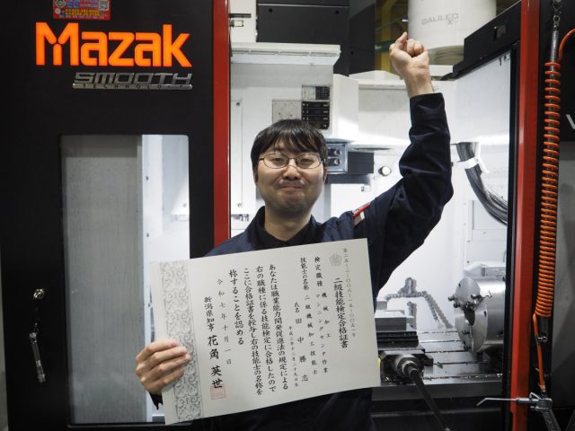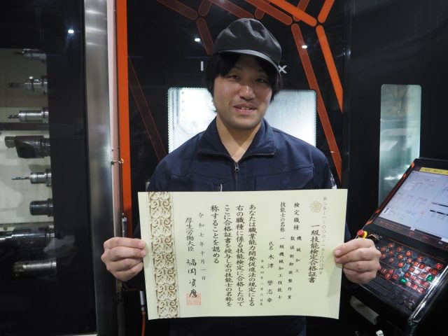 技能検定(数値制御旋盤1級・マシニングセンタ2級)に挑戦した弊社社員2名が、見事合格しました。