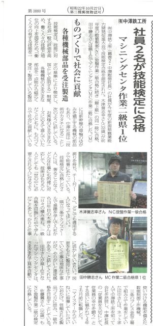 弊社社員2名の「技能検定」合格についての記事が、2月12日の「みつけ新聞」に掲載されました。
